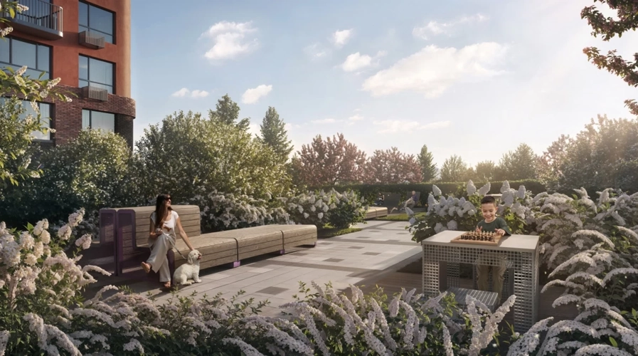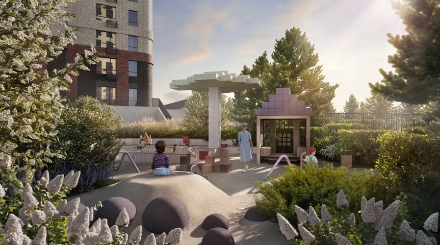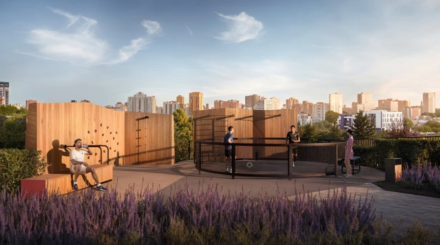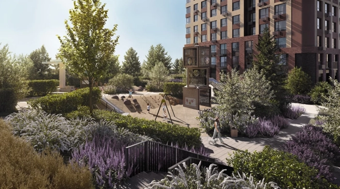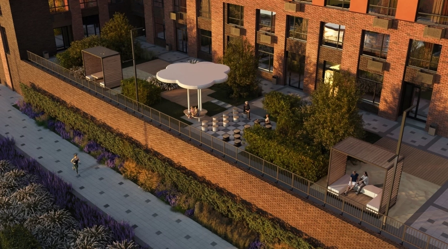 В малоэтажном корпусе двор рассчитан на тихий отдых и уединение. Во дворе высотки - современные детские площадки и лаунж-зоны для встреч и общения