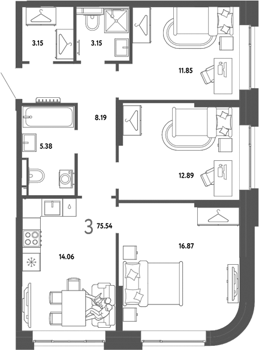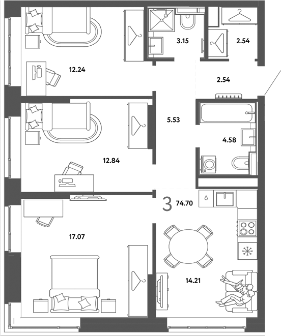 Площадь от 74.5 м2