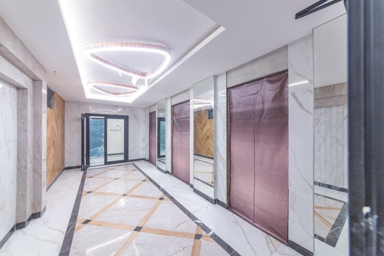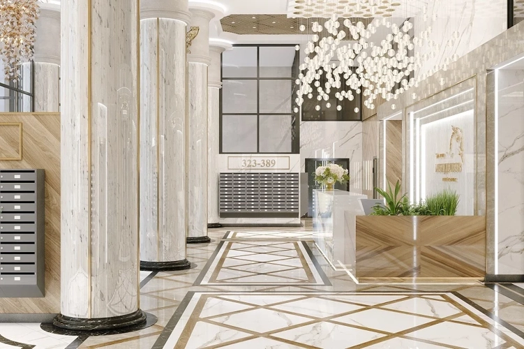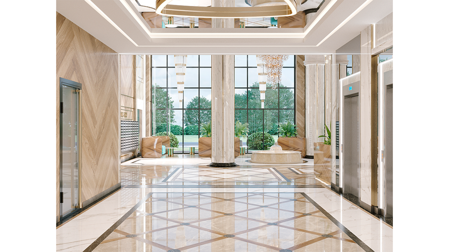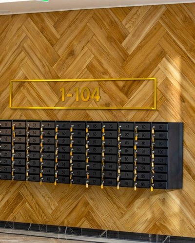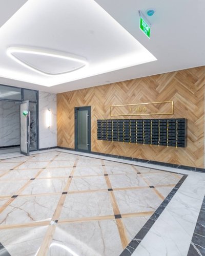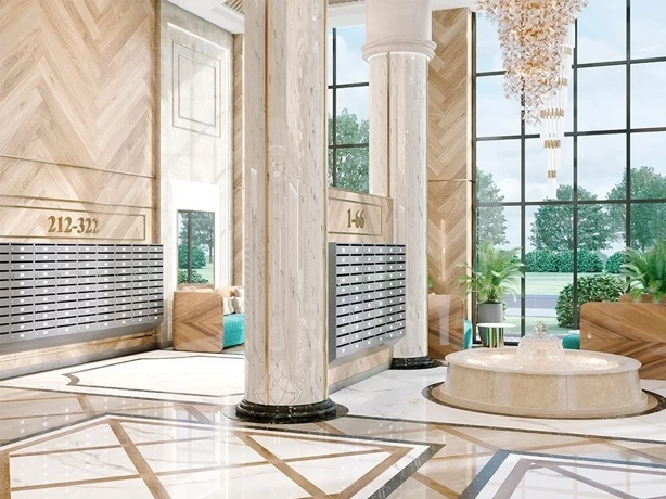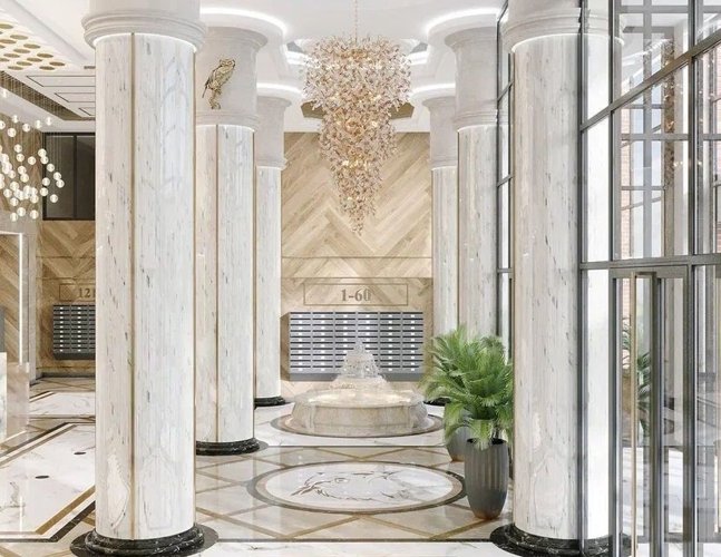 Просторное лобби с дизайнерским оформлением и мягкой мебелью встречает жителей с респектабельным уютом. Высокие потолки и панорамные элементы делают вестибюль визитной карточкой дома