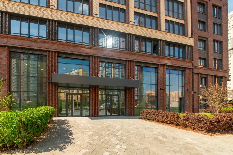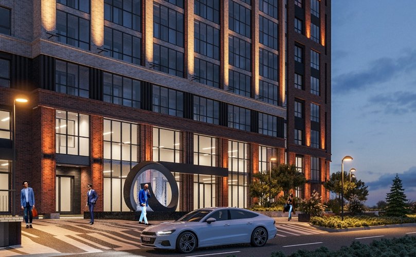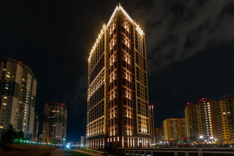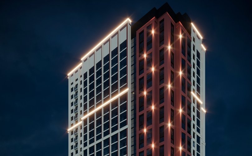 Фасады с витражным остеклением и декоративной подсветкой превращают дом в архитектурный акцент района. Вечером здание смотрится особенно эффектно и задаёт атмосферу всему кварталу