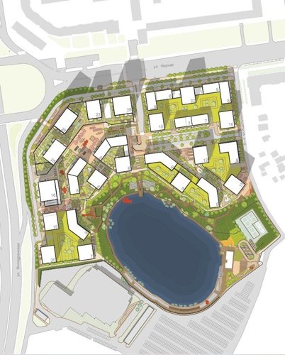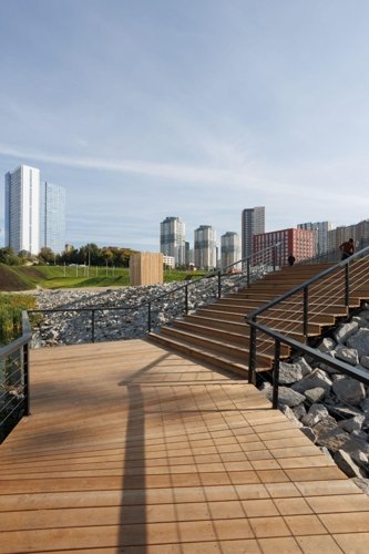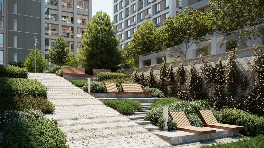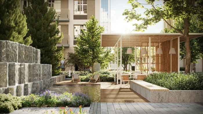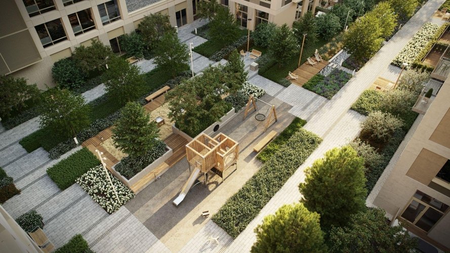Ландшафт включает водную детскую площадку, ручьи, водопад, фонтан, спортивные зоны, места отдыха и рабочие пространства под навесами. Дворы тихие, зелёные, вдохновлённые идеей пэчворка: разные покрытия и растения создают ощущение цельного природного пространства
