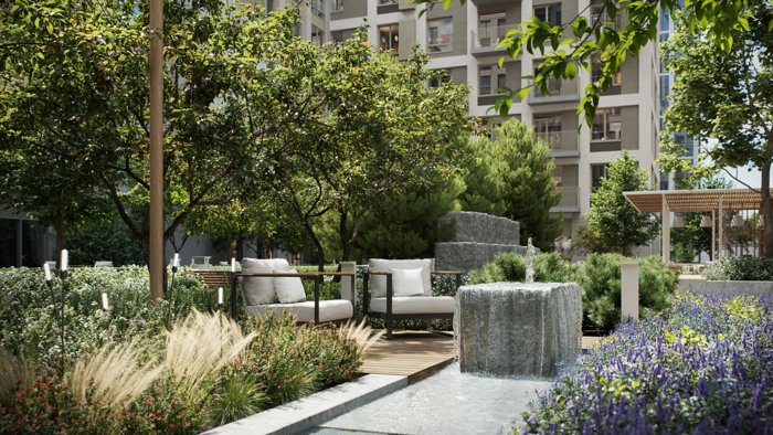 Многоуровневый ландшафт с водными игровыми площадками, зонами для удаленной работы, фонтанами и даже собственным огородом