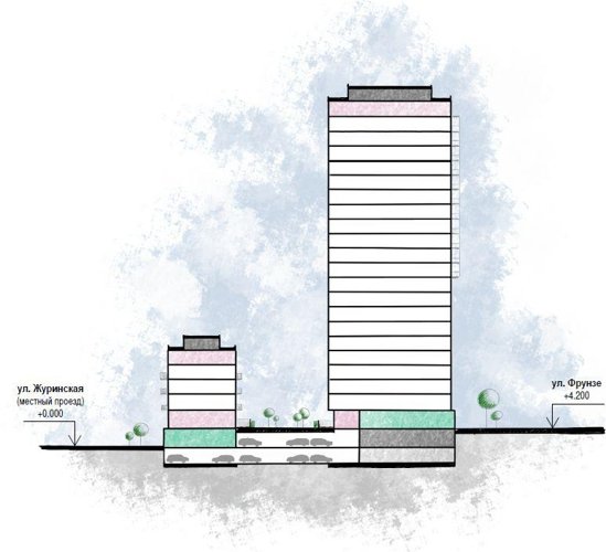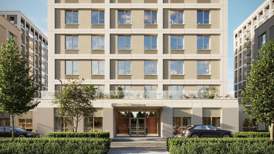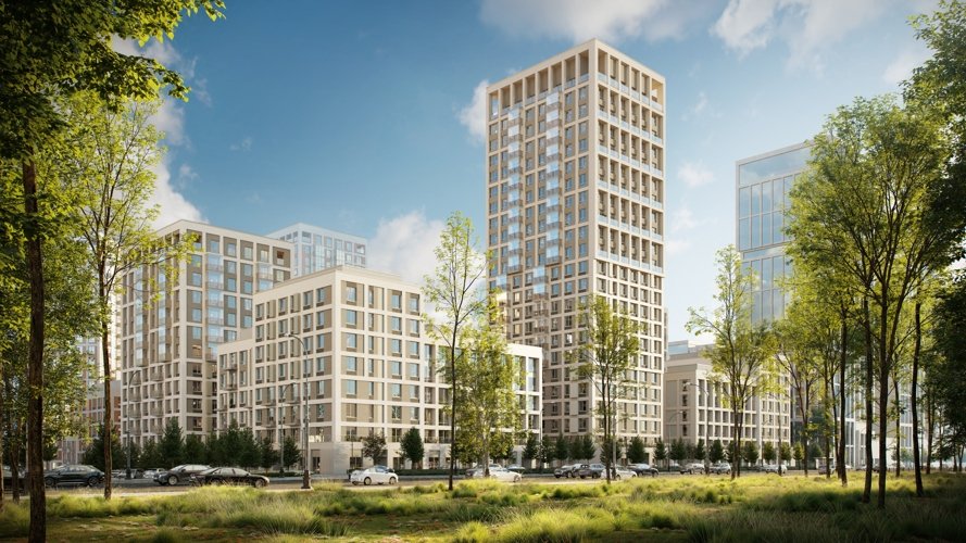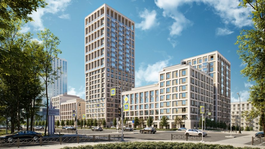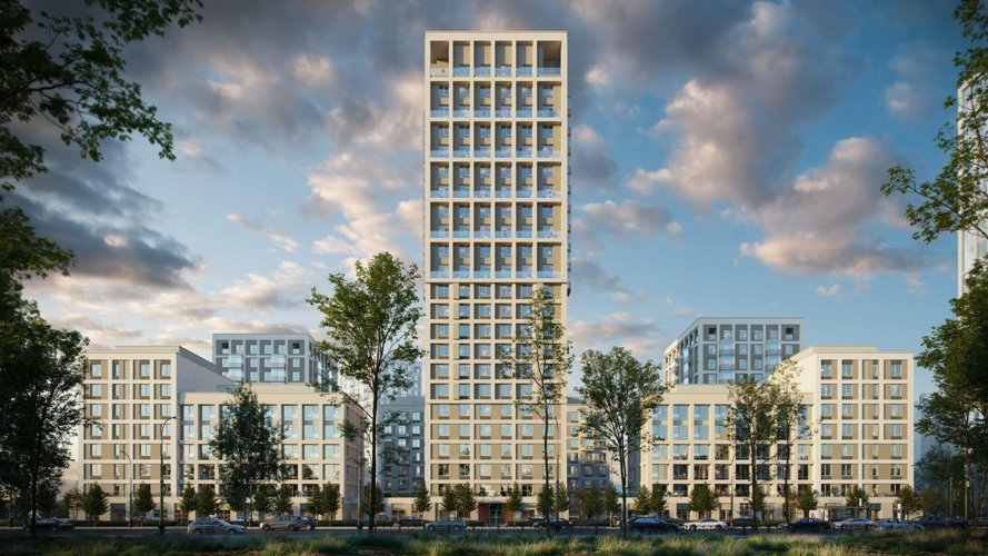 Благодаря продуманному переходу высотности дом кажется лёгким и гармоничным, а башня-доминанта делает квартал узнаваемым. Материалы фасада, витражи и строгая сетка формируют современный образ, не давящий на человека пространством