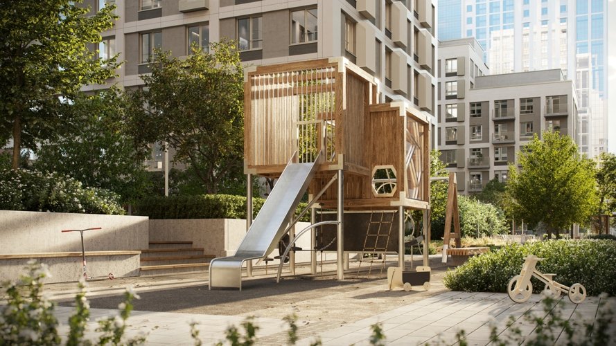 Внутренняя территория комплекса спроектирована так, чтобы в одном пространстве могли сосуществовать тишина и активность. Есть игровые зоны для детей разных возрастов, спортивные площадки, маршруты для прогулок и уютные места для отдыха. Благоустройство вдохновлено природными мотивами: водные элементы, зелёные островки и комфортные площадки создают ощущение живого дышащего пространства