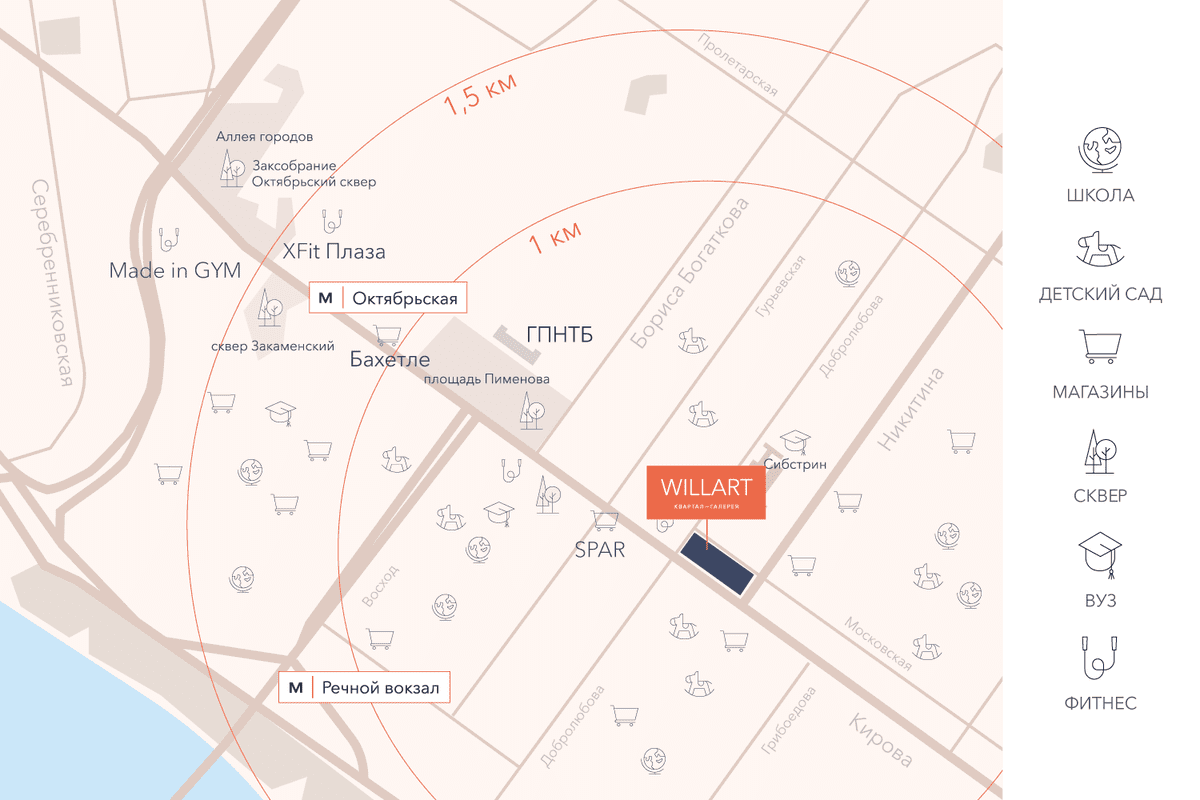 Квартал расположен на первой линии улицы Кирова, в 5 минутах от метро Октябрьская. Идеальная локация для тех, кто ценит время и хочет быть в центре событий